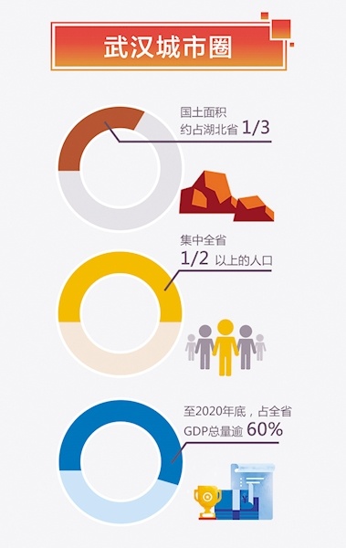 武汉城市圈是以武汉市为中心,由武汉及周边100公里范围内的黄石、鄂州、孝感、黄冈、咸宁、仙桃、天门、潜江9市构成的区域经济联合体,这一区域是湖北产业和生产要素最为密集、最具活力的地区。它以占全省三分之一的国土面积、二分之一以上的人口,创造了全省近三分之二的地区生产总值。