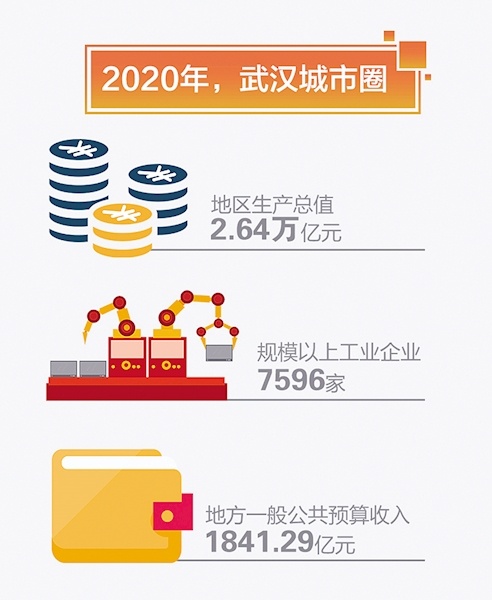 从经济总量上看,2020年武汉城市圈GDP超过了2.6万亿元,比2013年翻了一番,年均增长10%以上,比全省快2个百分点;从发展质量上看,2013年到2020年,武汉城市圈一、二、三产业结构由9.8:49.5:40.7调整为5:40:55,经济转型初步显现。