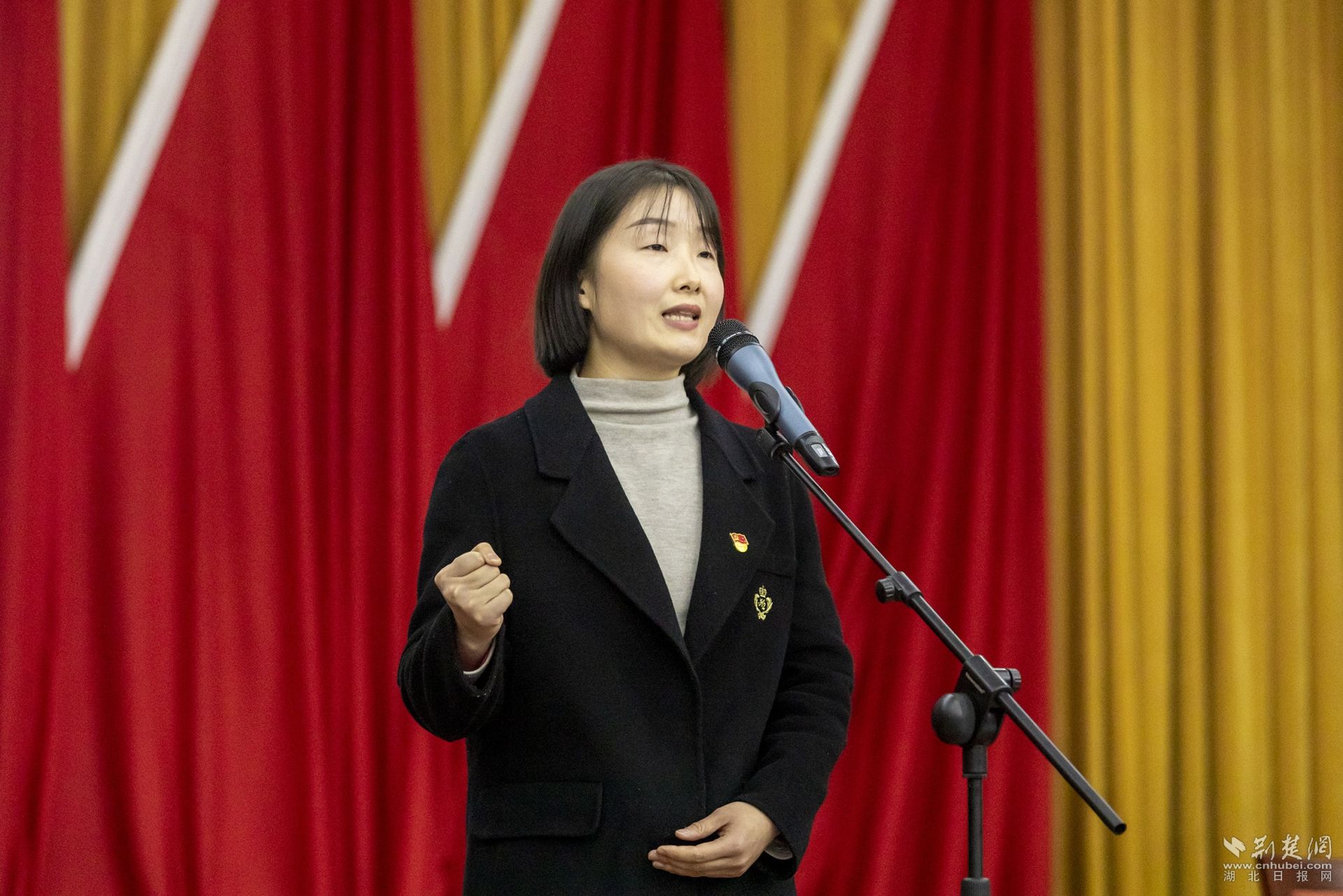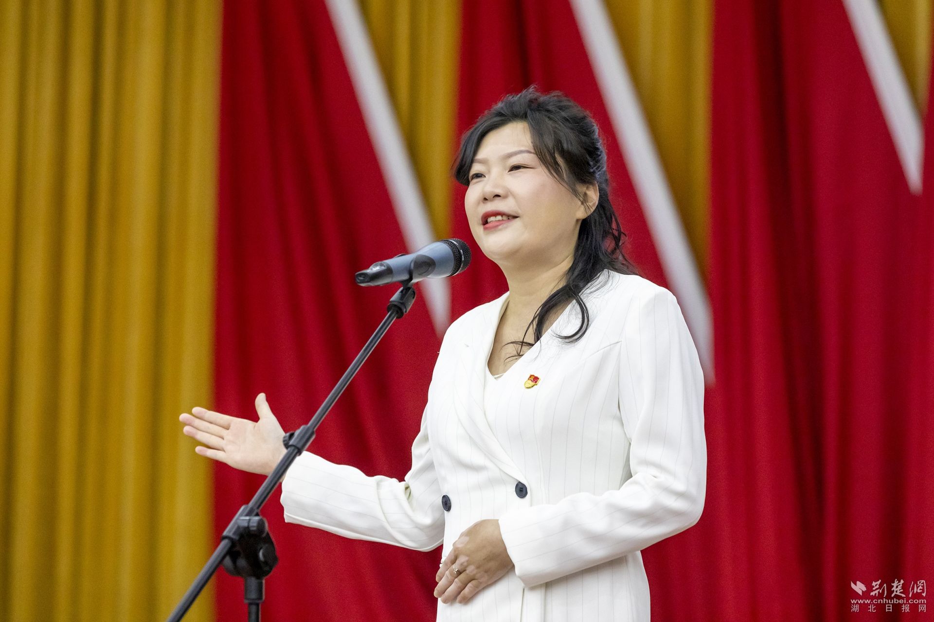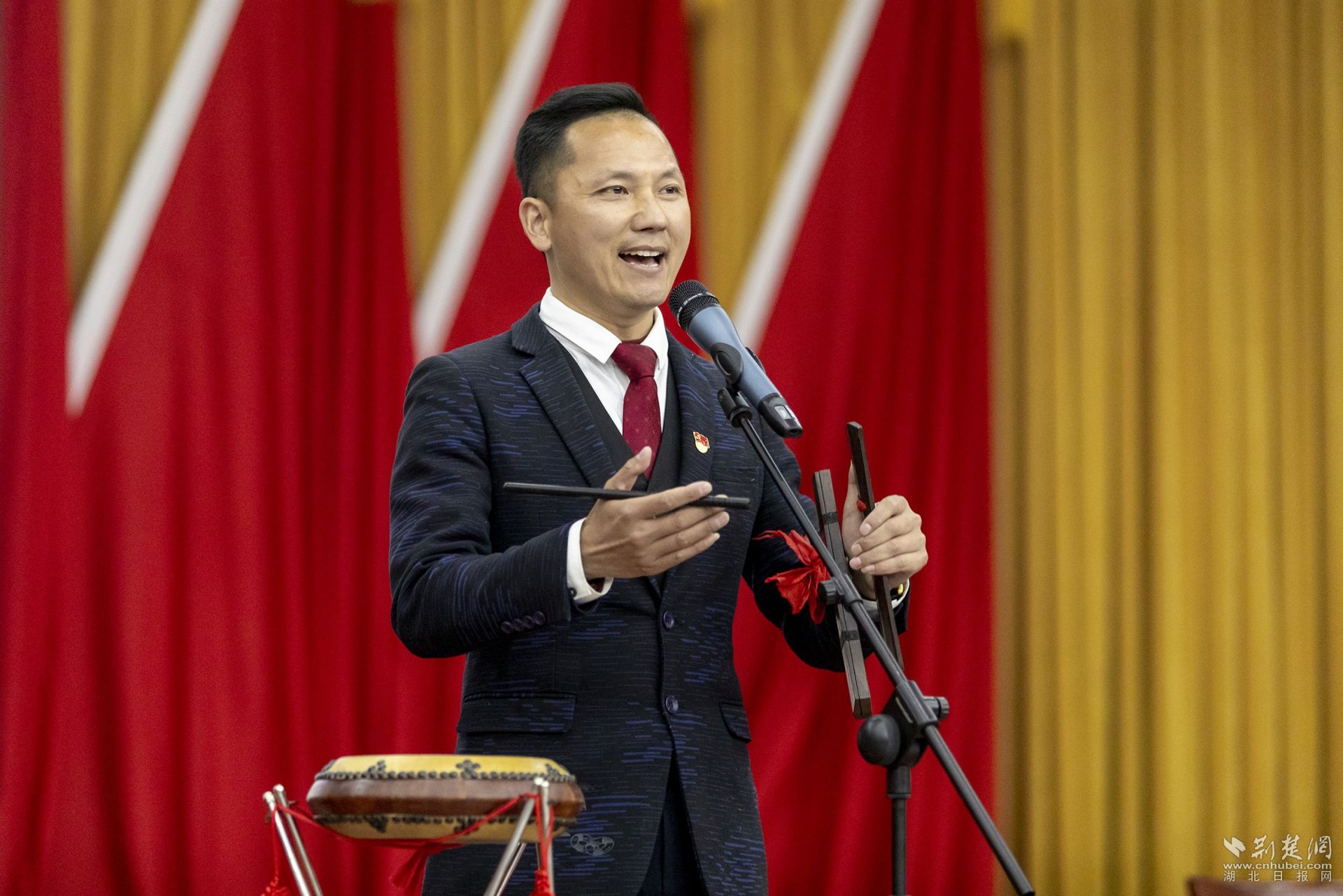 孝感市百姓宣讲大赛一等奖获得者、云梦县楚剧团青年演员陈加平用湖北大鼓宣讲党的十九届六中全会精神,拉开了宣讲活动的序幕,抑扬顿挫地宣讲,让与会人员听得津津有味,不时赢来阵阵掌声。