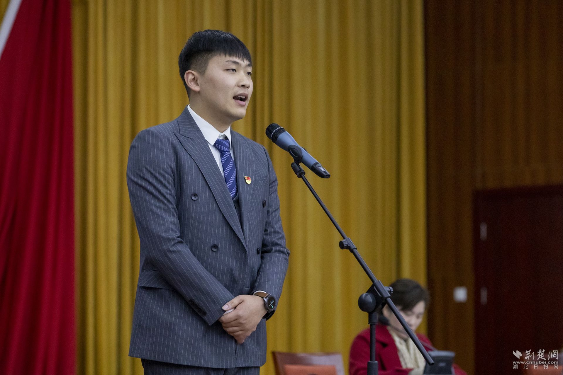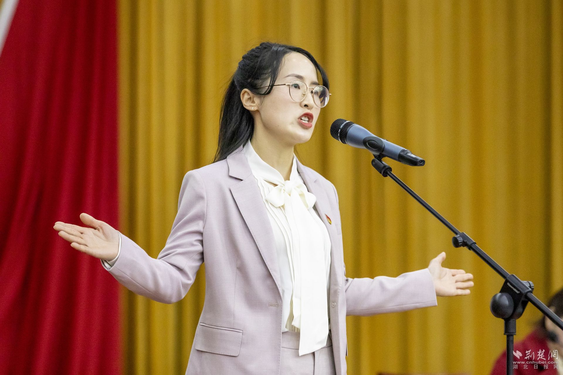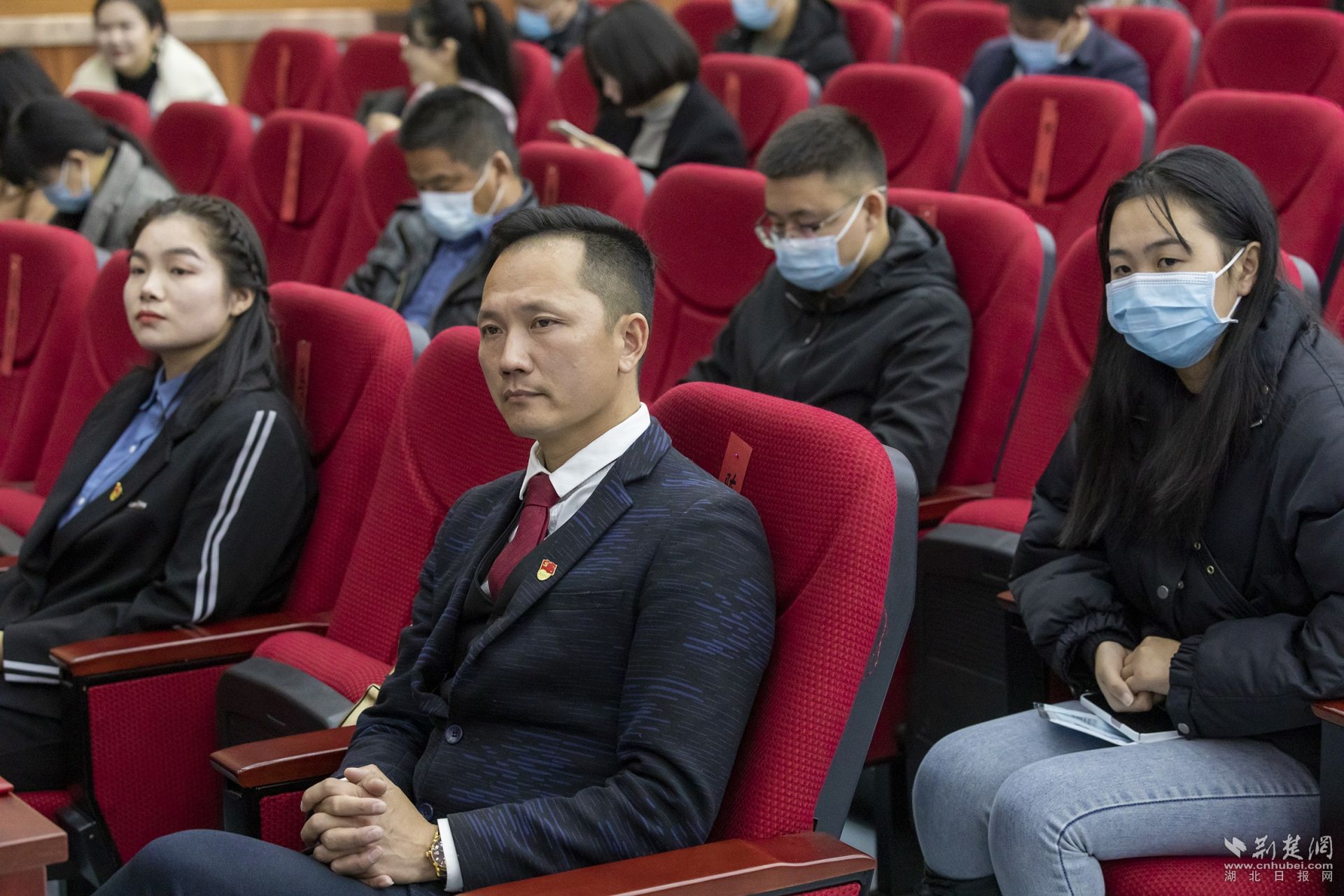 孝感市百姓宣讲大赛一等奖获得者、云梦县楚剧团青年演员陈加平用湖北大鼓宣讲党的十九届六中全会精神,拉开了宣讲活动的序幕,抑扬顿挫地宣讲,让与会人员听得津津有味,不时赢来阵阵掌声。