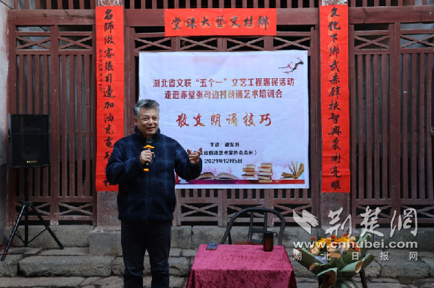 透过绿意盎然的竹林,演出的欢歌笑语声渐弱,不远处的祠堂里,是“乡村艺术小课堂”的读书声。省朗诵艺术家协会会长谢东升正在给村里的中学生和朗协会员们讲授“散文朗诵技巧”课。为解决当地“上艺术班难”、“学艺术贵”的困难,按照规划,湖北省、咸宁市、赤壁市三级文联分别组织艺术家入驻张司边村对当地开展常态化艺术辅导。记者在墙上的课程表上看到,近期开设的课程主要有朗诵、美术、书法课程,当天,三级文联为第一批艺术辅导老师谢东升、李君、葛蒲南、卢方祥颁发聘书。