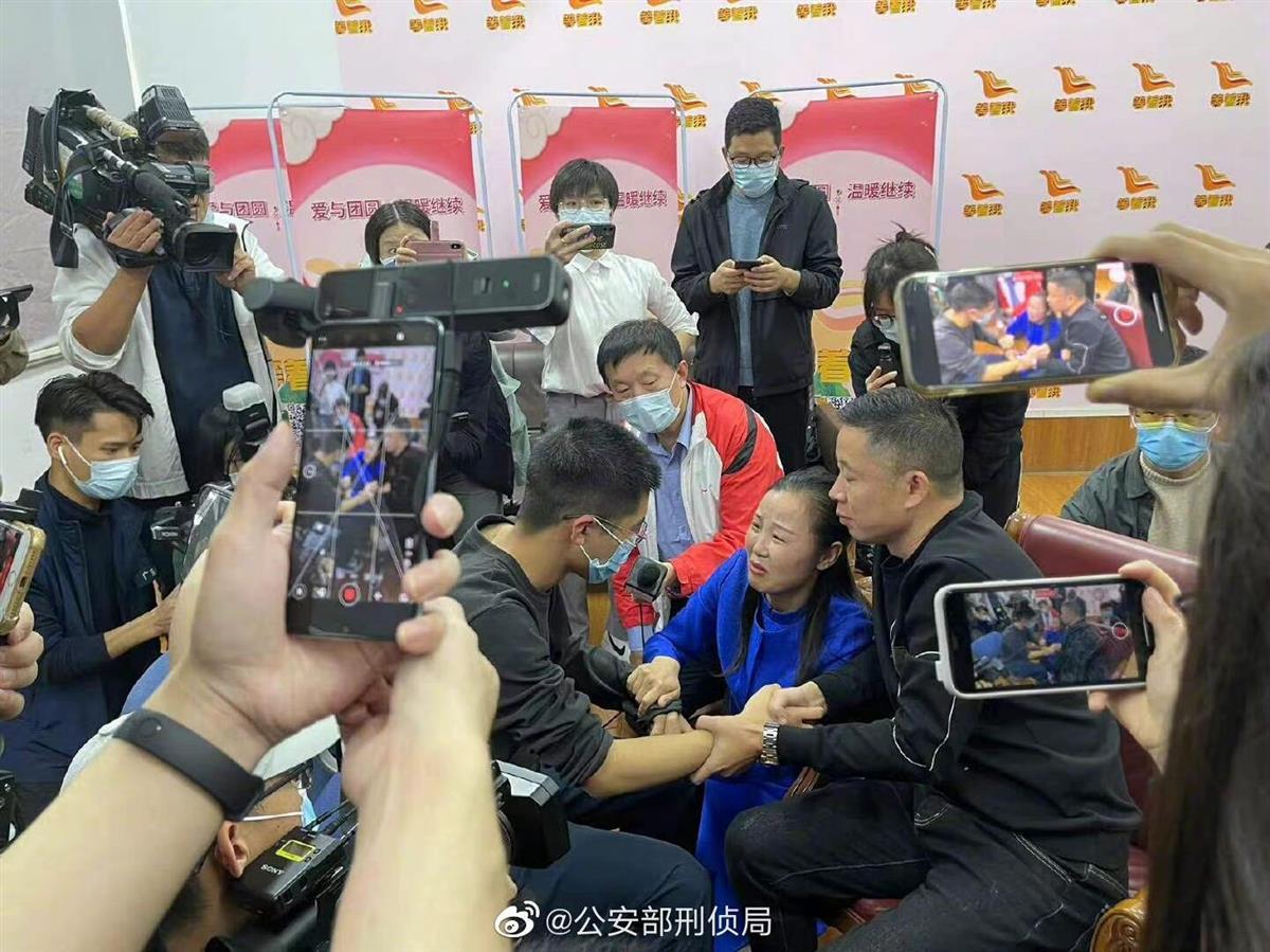 孙海洋抱着儿子痛哭,妻子在一旁抹泪(认亲现场直播截图)