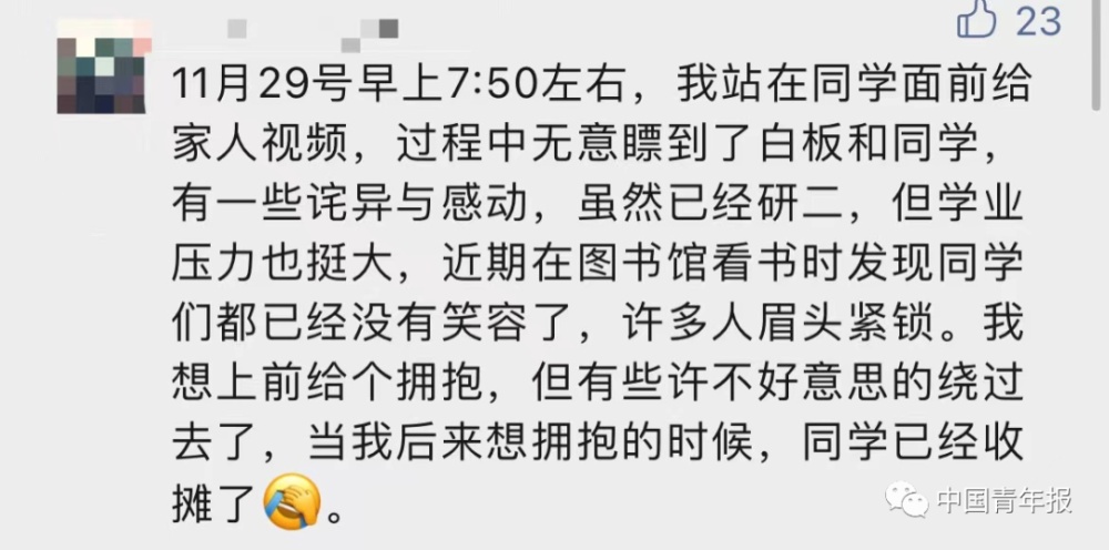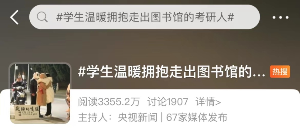 此前,话题#学生温暖拥抱走出图书馆的考研人#冲上热搜,郑州一高校学生也在图书馆附近,为近400位考研校友送上拥抱。