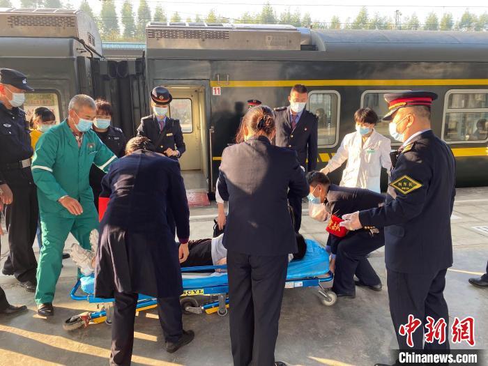 列车工作人员和120救护人员合力送产妇上救护车。 张黎明 摄