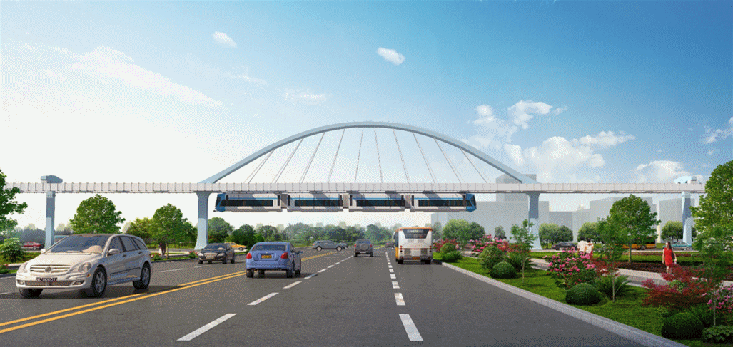 特点: 与跨坐式单轨系统的区别在于所依靠的轨道位于列车的上方,所占空间很小,能有效利用道路中央隔离带和城市低空,适于建筑物密度大的狭窄街区