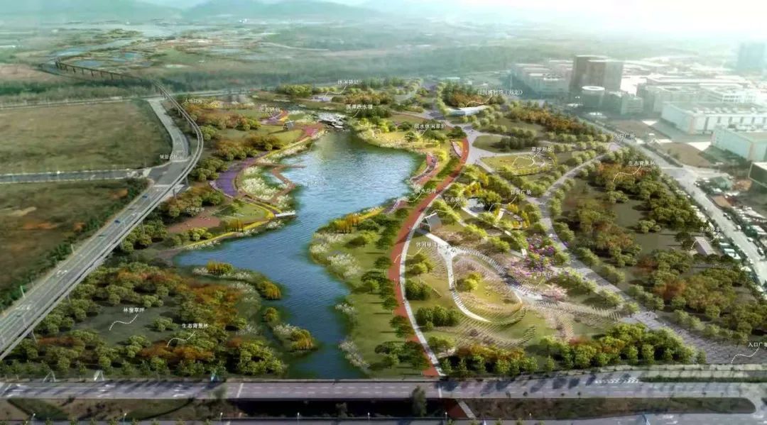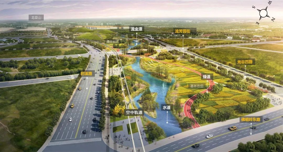 光谷中央生态大走廊“三道”整体布局:水道居中,绿道居西,空中轨道居东。