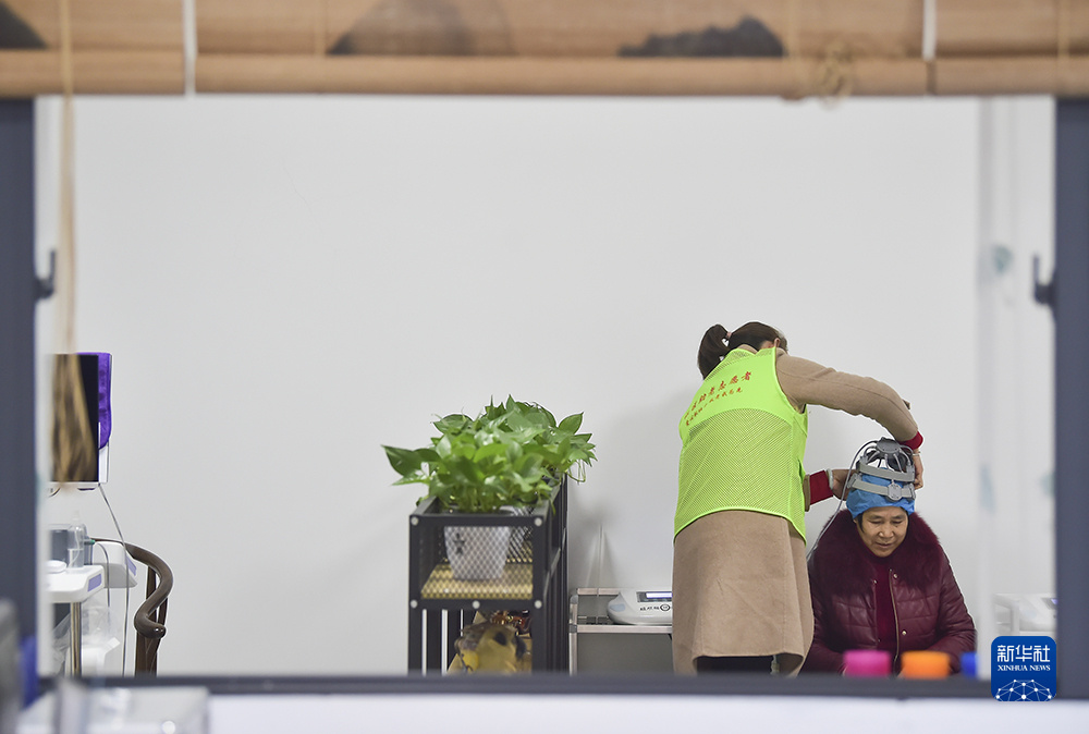 12月6日,老年人(右)在江北区观音桥街道明珠社区养老服务站体验经颅磁刺激仪。新华社记者王全超摄