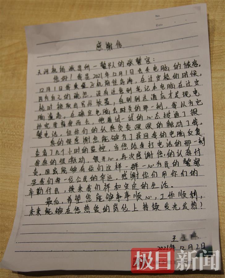 12月7日上午,当远在内蒙古乌海市的旅客王女士收到了遗失的笔记本电脑后,湖北省公安厅机场公安局航站区派出所值班民警非常欣慰:“监控查了2个多小时,辛苦没有白费,特别是她写来的感谢信,让我感觉非常温暖!”