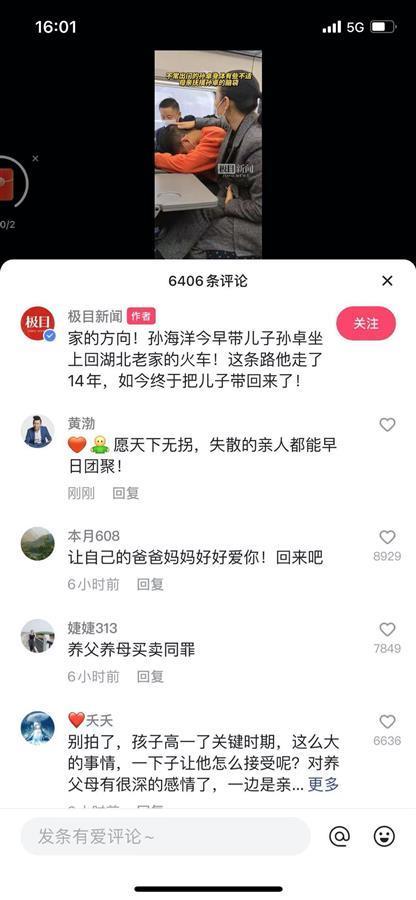 电影《亲爱的》主角原型人物孙海洋历经14年苦寻,终于找回当年被拐走的儿子孙卓,为电影续写了大团圆结局。12月7日,孙海洋夫妇带孙卓回湖北老家探亲,极目新闻记者贴身陪伴全程直播,在快手等多个视频平台吸引数百万名网友围观,其中也包括《亲爱的》男主角、影帝黄渤。