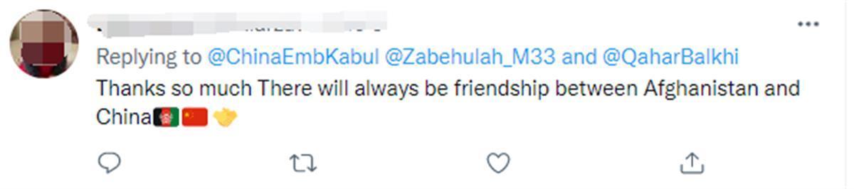 12月6日,大批阿富汗网友在中国驻阿富汗大使王愚的推文下留言,表达对中国的感谢。有网友说道:“在这种情况下,我们永远不会忘记中国。中国可以提供给一些大工程,让阿富汗人有努力工作的能力。这些援助可能会解决暂时的饥饿,谢谢。”