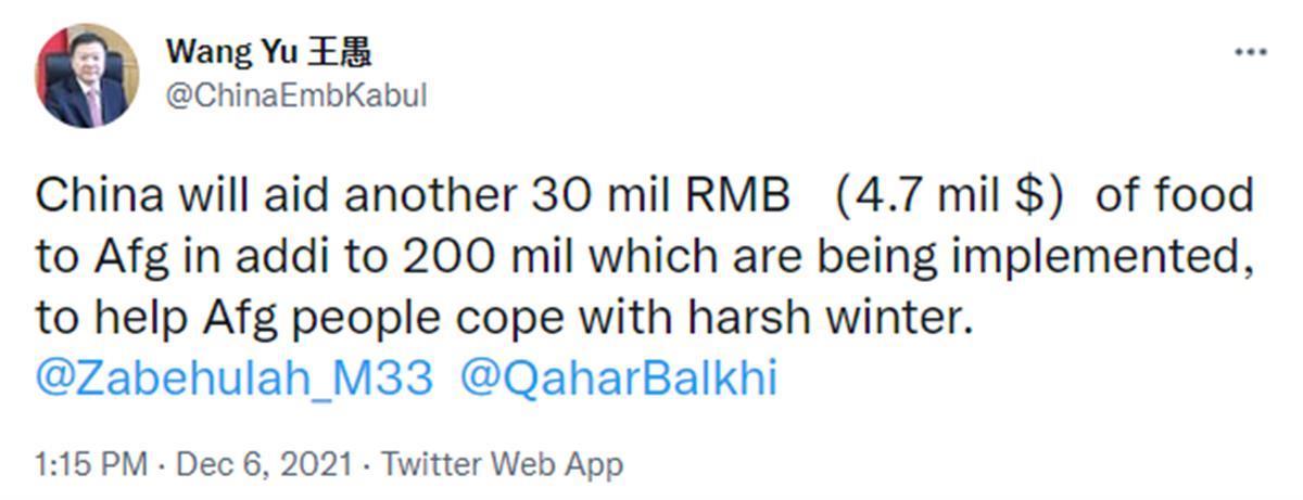 中国驻阿富汗大使王愚12月6日在推特上发布消息,在2亿元人民币物资援助的基础上,中国将再向阿富汗提供3000万元人民币的粮食援助,这将帮助阿富汗民众应对严峻的寒冬。大批阿富汗网友在该推文下留言“感谢中国!”“我们永远不会忘记!”