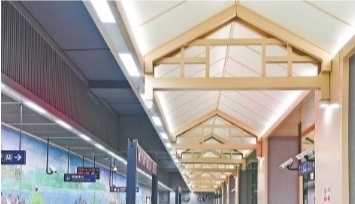 车站吊顶也别具一格,从码头潭文化遗址公园入手,提取明清古建筑造型特征,在其基础上简化造型,并加以变化,结合柱面使其成为一个整体,用现代手法和材质体现此地古今的繁荣特质。