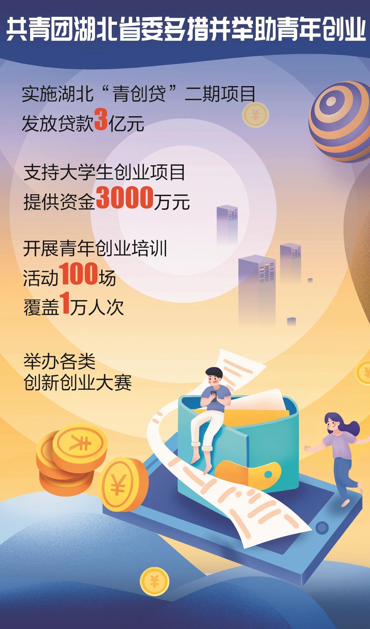 今年,共青团湖北省委开展“我为群众办实事 我为青年做件事”实践活动,聚焦青年创业难点、痛点,实施湖北“青创贷”二期项目,发放贷款3亿元;支持大学生创业项目资金3000万元;开展青年创业培训活动100场,覆盖1万人次,举办各类创新创业大赛,多措并举助力厚植创业土壤,助力青年实现创业梦。