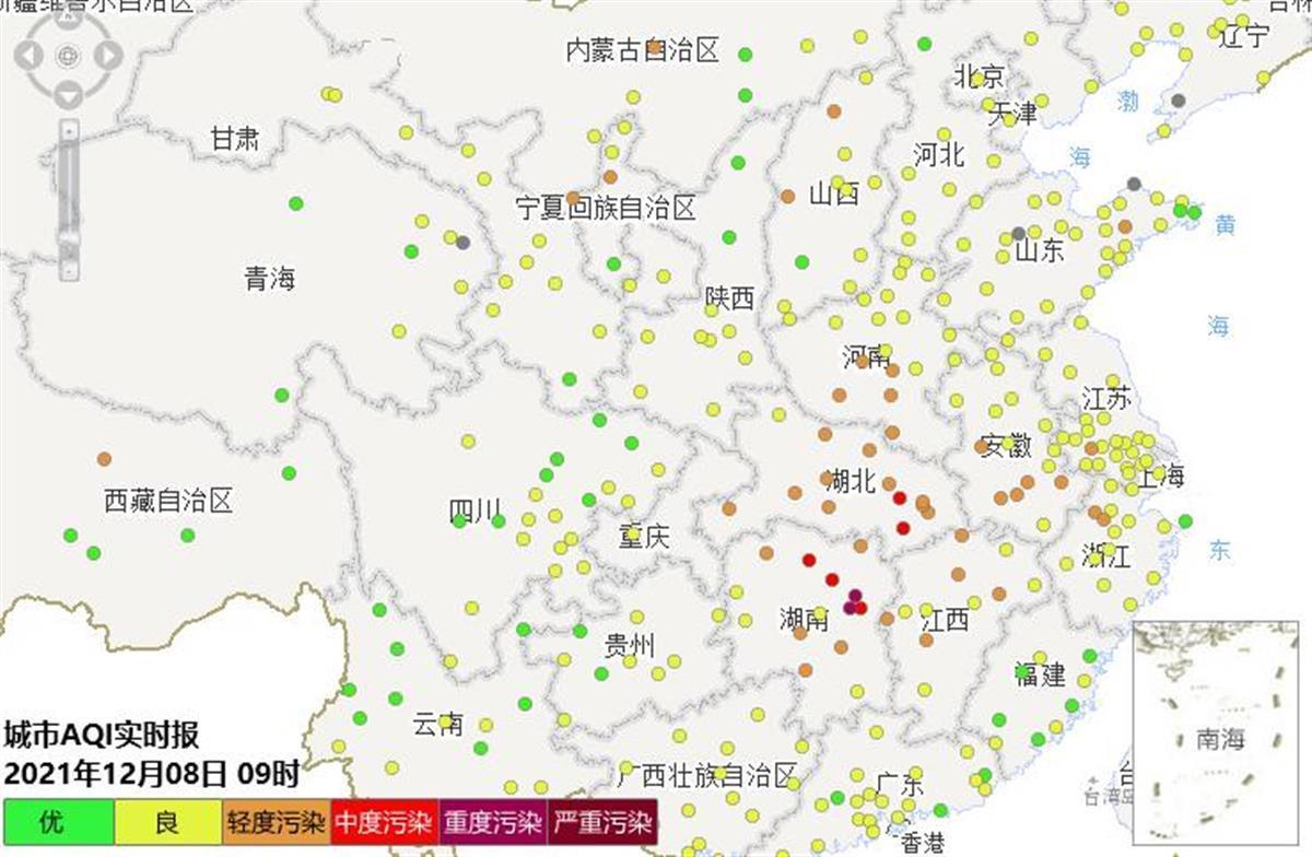 全国范围内,河南、安徽、浙江、湖南、江西、甘肃、山西、新疆等地部分城市为轻度到重度污染,首要污染物为PM2.5或PM10。省内城市空气质量以轻度污染为主,武汉、咸宁为中度污染,首要污染物为PM2.5。