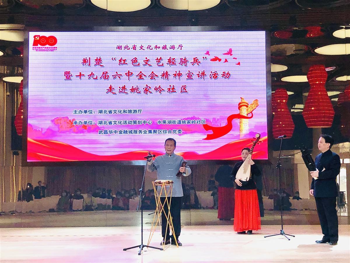 “红色文艺轻骑兵走基层,六中全会精神入民心。”12月2日,武汉市武昌区水果湖街道姚家岭社区邀请湖北省文化和旅游厅荆楚“红色文艺轻骑兵”六中全会精神宣讲小分队进社区,在长城汇楼宇带领社区党员、居民骨干、企业职工从党的十九届六中全会精神中汲取奋进力量。