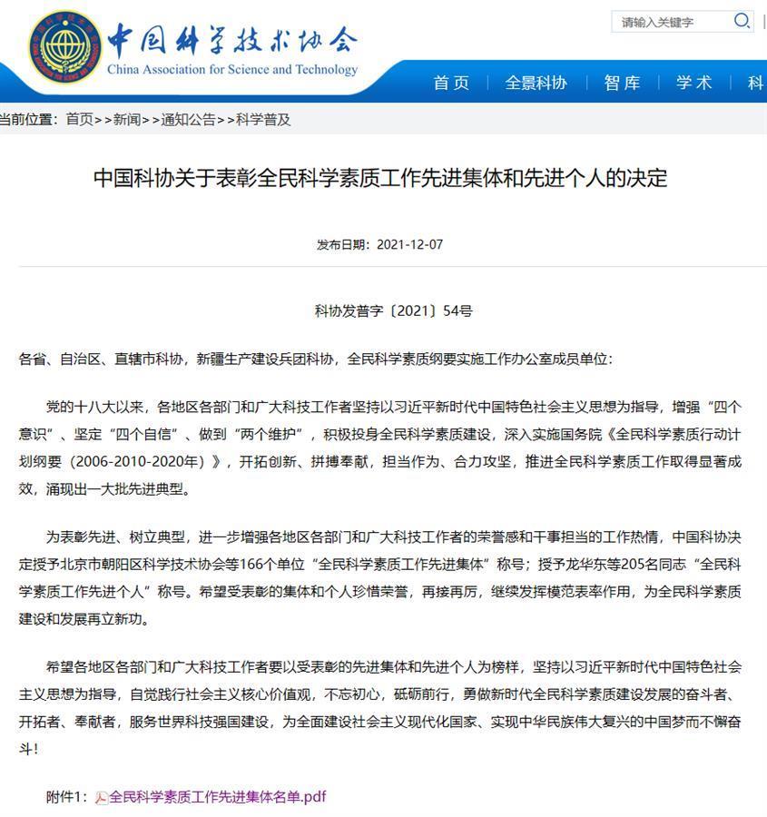 12月7日,中国科学技术协会官网公布全民科学素质工作先进集体和先进个人名单。其中,湖北省共有4个集体、6名个人上榜。