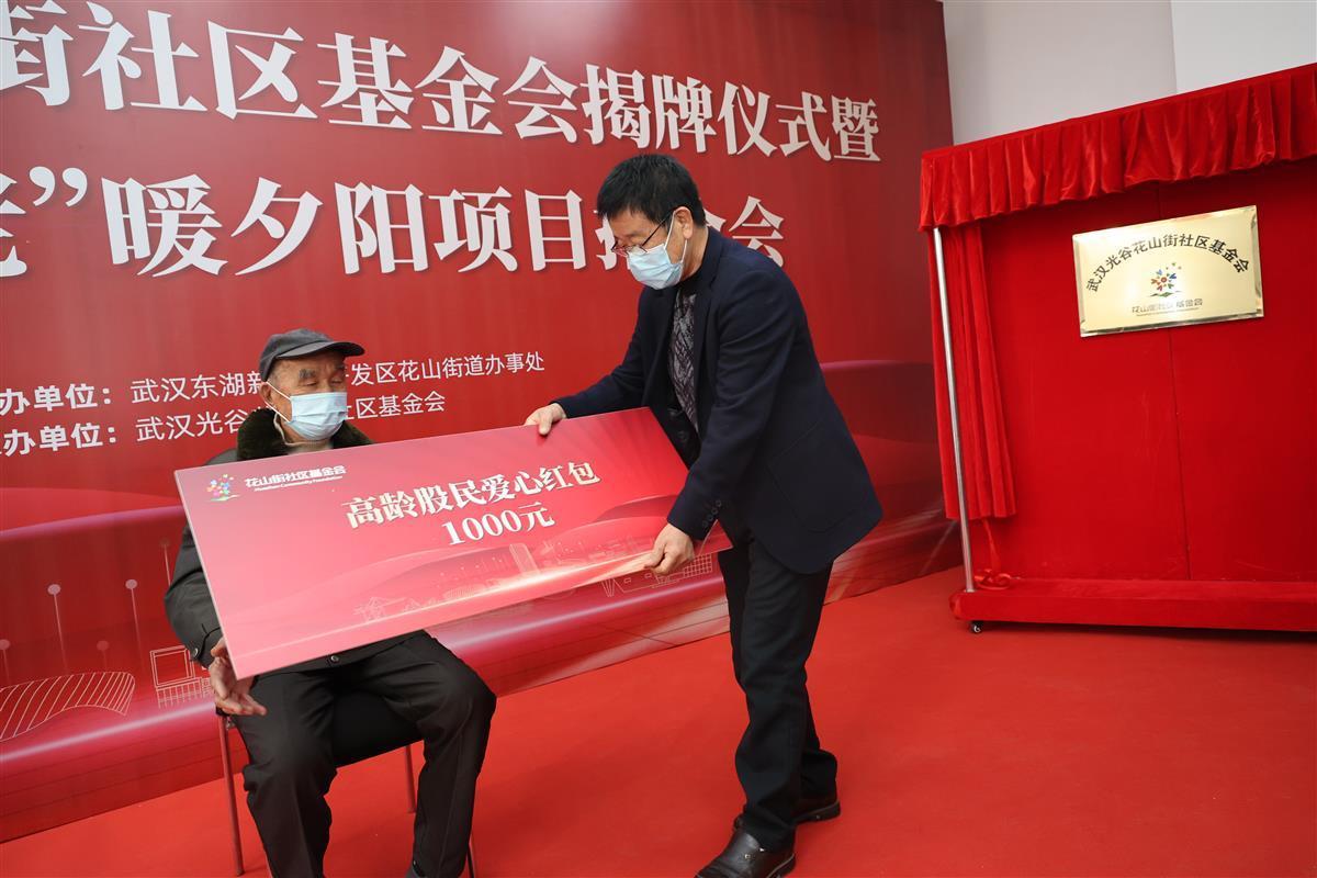 揭牌仪式现场,基金会为花山街80岁以上高龄原住民发放“慈善惠老”爱心红包,92岁的张润芝和84岁的肖长全分别收到了1500元、1000元爱心红包。