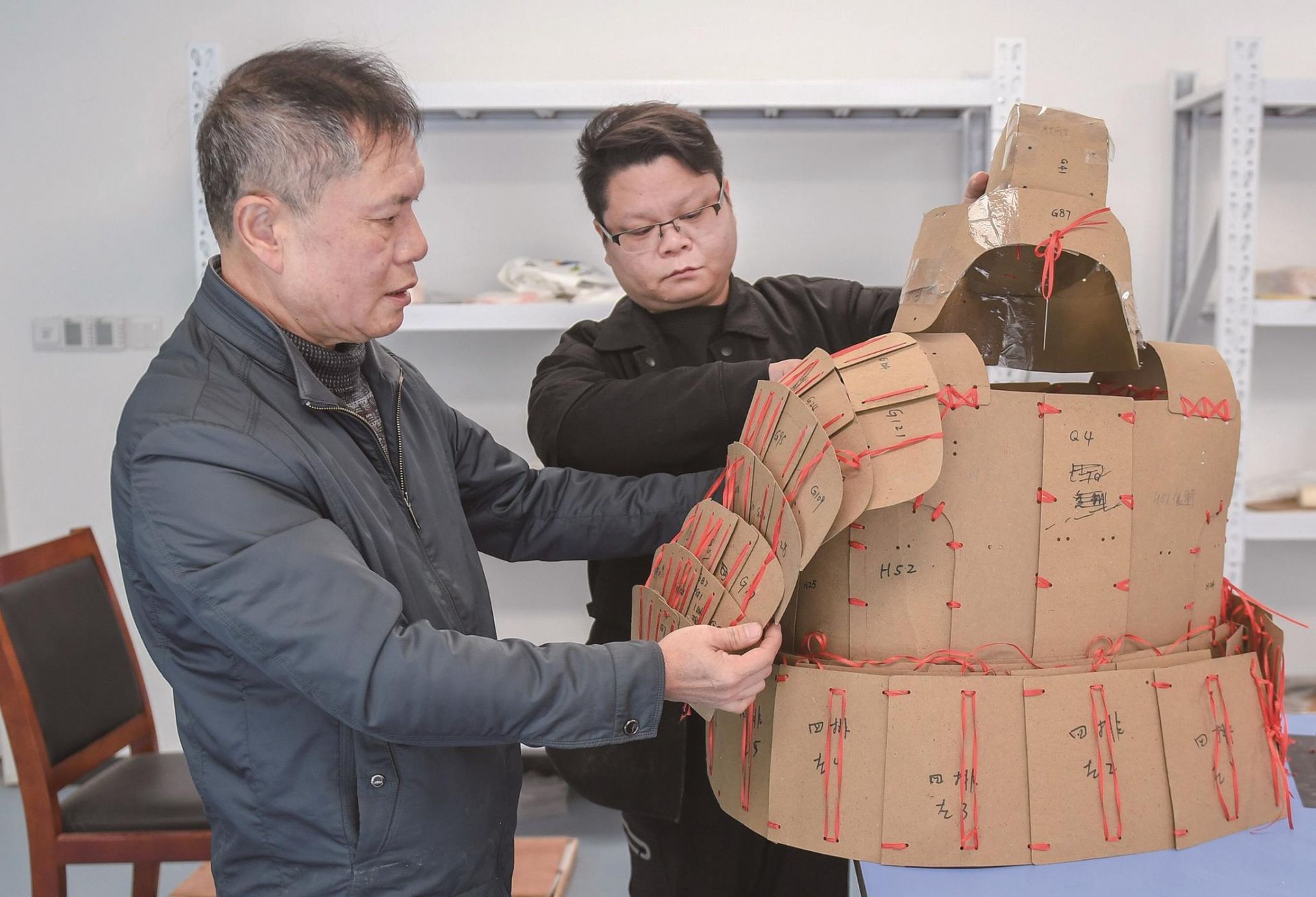 方晨举着这个模拟品向记者介绍道,模拟品的每一个部件都与文物原件同等大小,排列顺序也保持完全一致,“接下来就是要处理原始漆壳,与甲片一一对应进行粘贴、串联,最后套在人体模型上就可以展出了。”