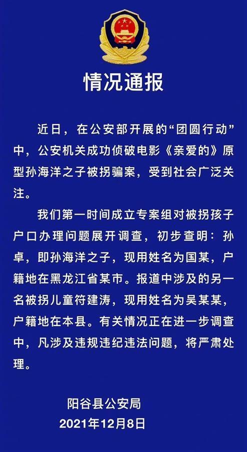 12月9日凌晨,山东省阳谷县公安局在微信公众号上发布情况通报称,近日,在公安部开展的“团圆行动”中,公安机关成功侦破电影《亲爱的》原型孙海洋之子被拐骗案,受到社会广泛关注。阳谷县公安局第一时间成立专案组对被拐孩子户口办理问题展开调查,初步查明:孙卓,即孙海洋之子,现用姓名为国某,户籍地在黑龙江省某市。报道中涉及的另一名被拐儿童符建涛,现用姓名为吴某某,户籍地在阳谷县。有关情况正在进一步调查中,凡涉及违规违纪违法问题,将严肃处理。