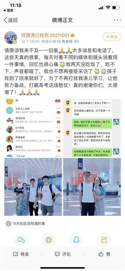 彭冬英:今早班主任给我打电话说,最近很多人加符建涛好友、打他的电话。孩子在学校情绪波动比较大。符建涛现在是高三,让我们减少外界对他的打扰。我也想跟媒体还有网友说一声,未来希望减少对我们的关注。