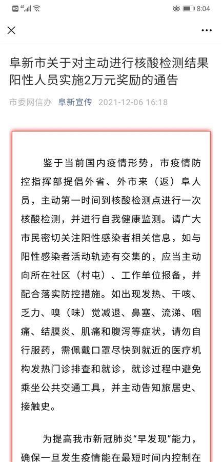 无独有偶。12月6日,辽宁省阜新市疫情防控总指挥部也发布了《关于对主动进行核酸检测结果阳性人员实施2万元奖励的通告》。8日晚上,记者从当地卫健部门获悉,阜新市目前没有确诊病例,居民均正常上下班。