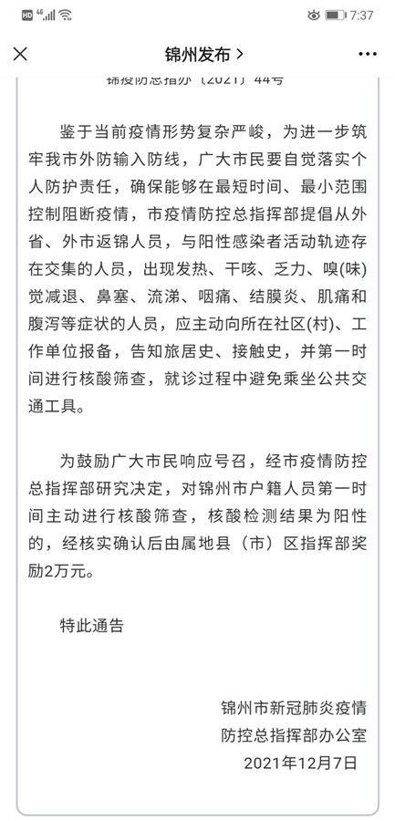 12月7日晚,锦州市政府官方微信“锦州发布”发出一条信息《关于对主动进行核酸筛查结果阳性人员实施奖励的通告》。通告中写道:“锦州市疫情防控总指挥部提倡从外省、外市返锦人员,与阳性感染者活动轨迹存在交集的人员,出现发热、干咳、乏力、嗅(味)觉减退、鼻塞、流涕、咽痛、结膜炎、肌痛和腹泻等症状的人员,应主动向所在社区(村)、工作单位报备,告知旅居史、接触史,并第一时间进行核酸筛查,就诊过程中避免乘坐公共交通工具。为鼓励广大市民响应号召,经锦州市疫情防控总指挥部研究决定,对锦州市户籍人员第一时间主动进行核酸筛查,核酸检测结果为阳性的,经核实确认后由属地县(市)区指挥部奖励2万元。”