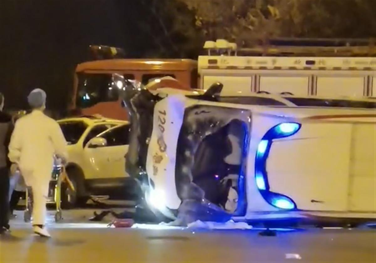 据网传视频显示,两辆救护车与一辆消防车正停在路边,几名消防员正从侧翻车辆中破窗救人。侧翻车辆车头,还印有“120”等字样,但字体已经被撞得扭曲。