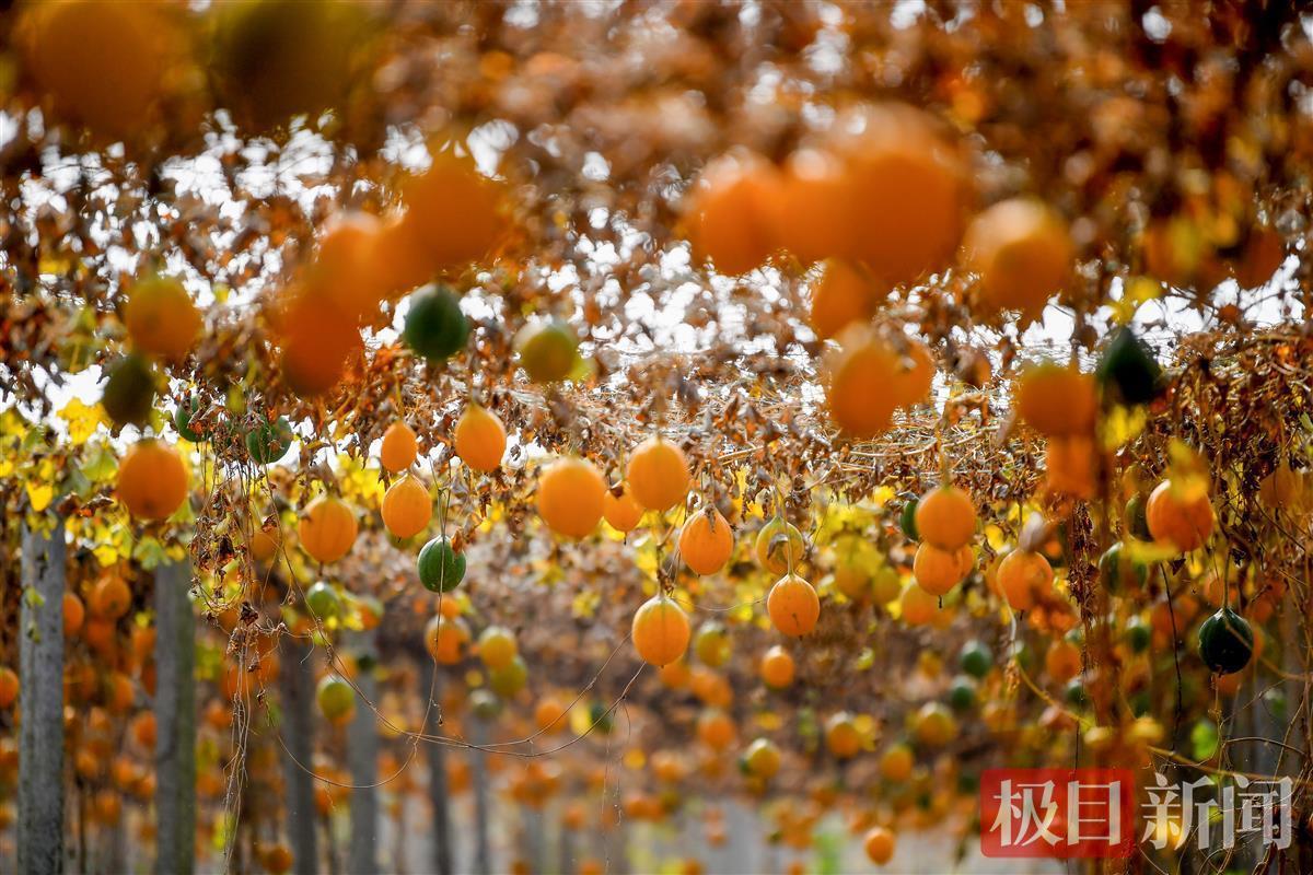 近日,新洲“金瓜”丰收。外表金黄,形似葫芦的瓜蒌,从藤蔓上垂吊下来,可爱诱人。在武汉市新洲区汪集街陶咀村,近期正是金色瓜蒌丰收的时节。