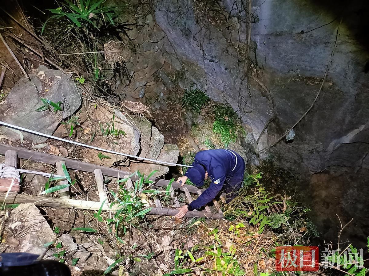 为进一步了解天坑内的地貌及彭某伤情,民警组织群众借来木质长梯,用绳索系住长梯顶部,将长梯放下到天坑上端处的一块平台,民警赵威系上安全绳,深入天坑内查看,发现彭某在坑底呼吸急促,情况十分危急。