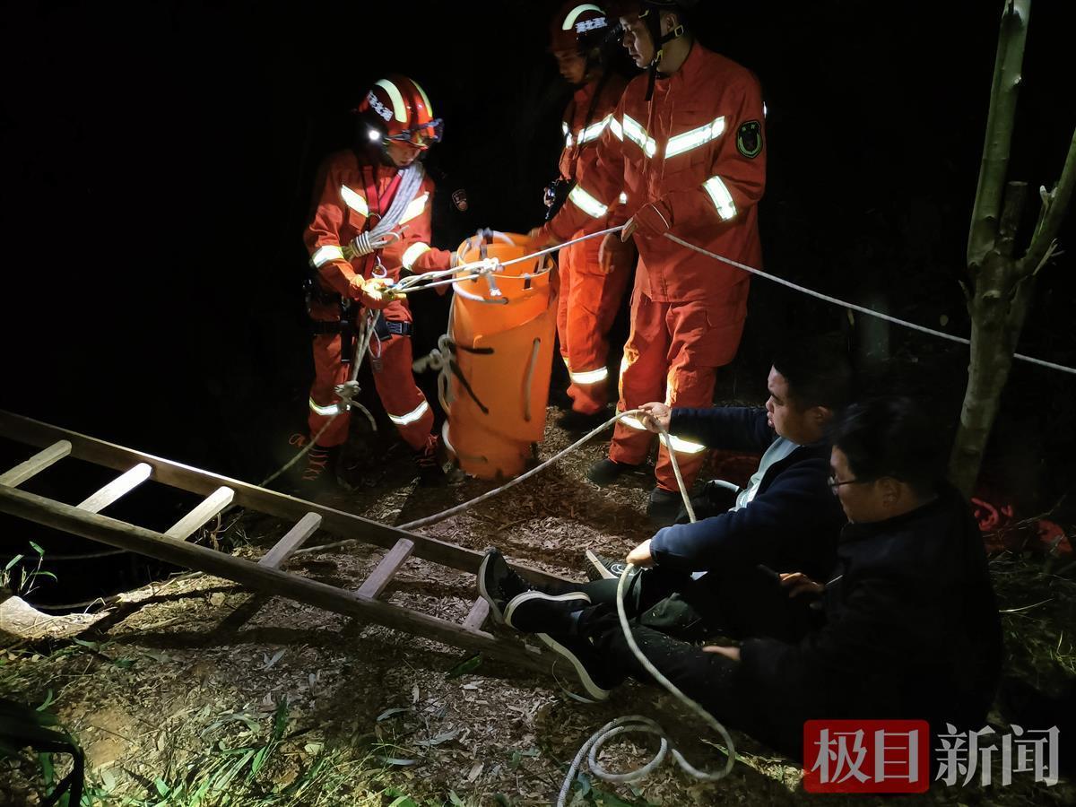 雷五阳、吕良伟迅速组织村干部及群众开辟一条救援通道,接应县应急救援派来的消防员,将多功能担架、软梯、滑轮等救援装备扛到现场。民辅警同消防员将长梯横在天坑顶部,在横梯中间安装滑轮,安排人员稳住长梯不致其侧滑,由两名经验丰富的消防员携带安全绳、消防腰带、多功能担架等救援装备,深入坑底进行救援,民警组织力量在天坑洞口外拉救援主绳、安全绳。