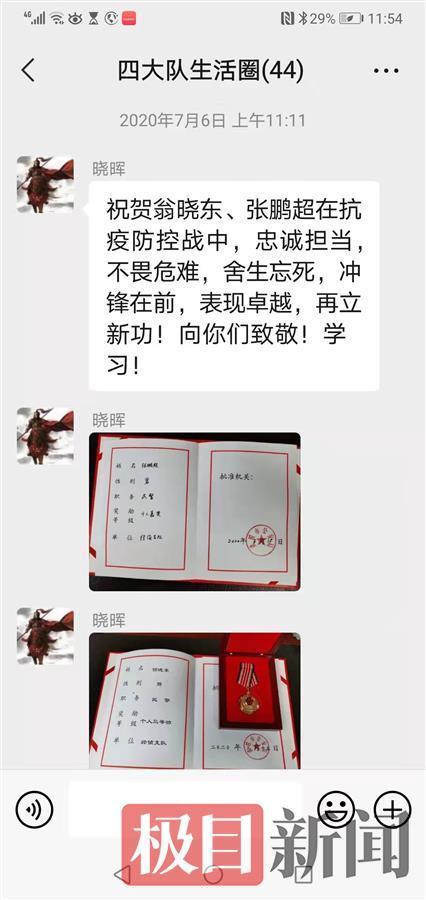 因表现突出,两名青年民警立功受奖。2020年7月6日上午11时,刘晓晖第一时间在群里发布消息:“翁晓东、张鹏超在抗疫战斗中忠诚担当、不畏危难,舍生忘死、冲锋在前,二人表现卓越、再立新功!向你们致敬!学习!”其他民警及家属都在群里点赞,翁晓东、张鹏超的父母也在群里,打心眼里为孩子们感到骄傲。两位青年民警也觉得十分光荣,干劲更足了。