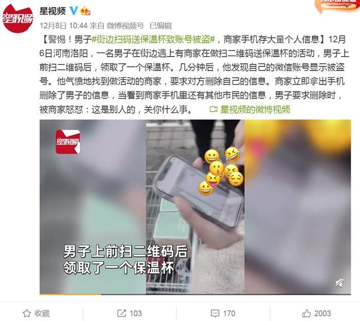 中新网客户端北京12月9日电(记者 吴涛)近日,有消息称,一名男子在街边遇上有商家在做扫二维码送保温杯的活动,男子上前扫二维码后,领取了一个保温杯。几分钟后,他发现自己的微信账号显示被盗号。
