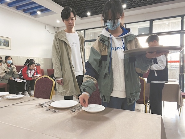 通过三个多月的教学,余昊天观察到部分学生平时训练能达标,考试容易出现纰漏。他认为这跟学生紧张的心态有关,决定加强训练他们的心理素质。“哪里人多就把学生带到哪里去训练。”余昊天介绍,实训课时,他将学生集中到实训室内,让他们在训练摆台时互相观察彼此;托盘训练时,他将学生转移到操场,学校校领导和各科任课老师也到现场观摩。渐渐地,学生能够克服紧张的情绪,全神贯注地投入到测试中。