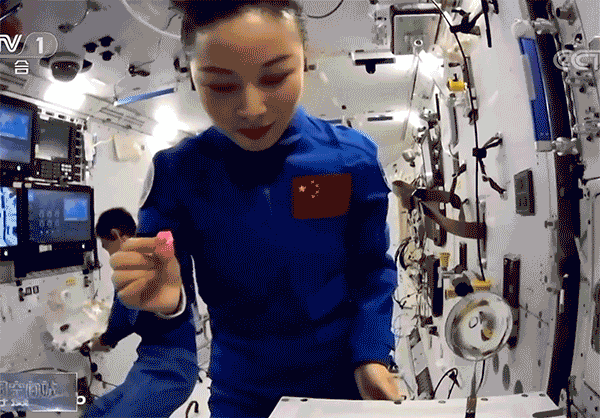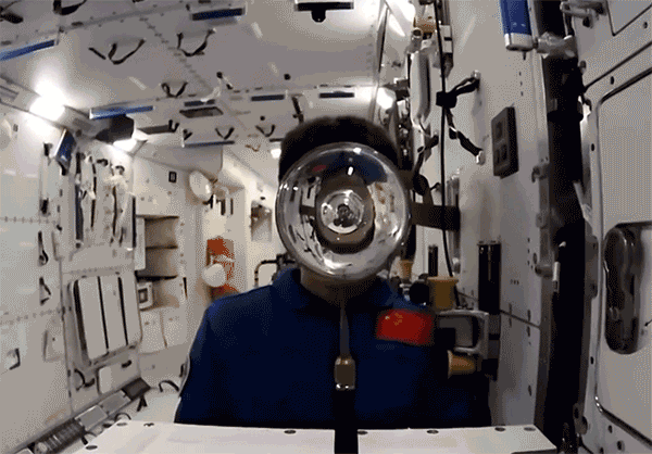 实验现象:三位航天员首先为大家展示了在太空中转身的神奇现象,这个原本在地面上难度系数为零的普通动作,在太空中却隐藏着很高的物理知识。太空中人体上半身左转时,下半身右转;手臂左转时,身体其他部分将右转。