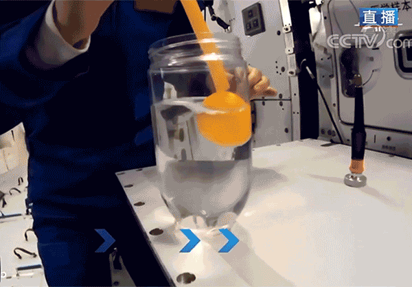 原理解读:泡腾片里通常有碳酸氢钠和柠檬酸(或其他弱酸),在地面上把它扔进水杯里时,酸和水发生反应产生二氧化碳气泡,由于存在浮力,二氧化碳气泡迅速上浮,然后在水面上消失;到了空间站里,气泡不受浮力影响,均匀地向四周扩散,其中绝大多数气泡留在水球中,极少数气泡突破水球的表面扩散到空气中。