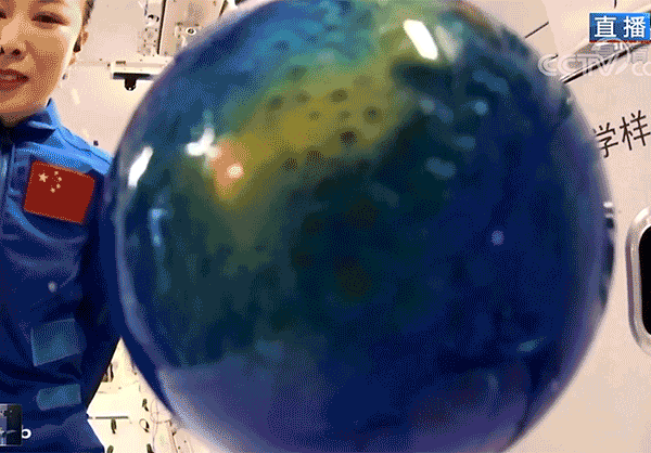 实验现象:王亚平将蓝色颜料液体注入水球中,变成一个蓝色水球,王亚平泡腾片插入蓝色水球中,泡腾片产生的绝大部分气泡包裹在水球里,变成一个气泡球,像一颗蔚蓝的地球。
