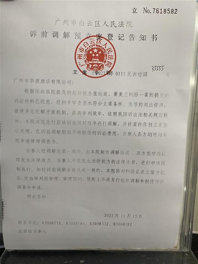 12月8日,广州白云区人民法院进行庭前调解,可张先生一家人抵达指定地点后发现酒店方没有人前来,故调解未能进行。