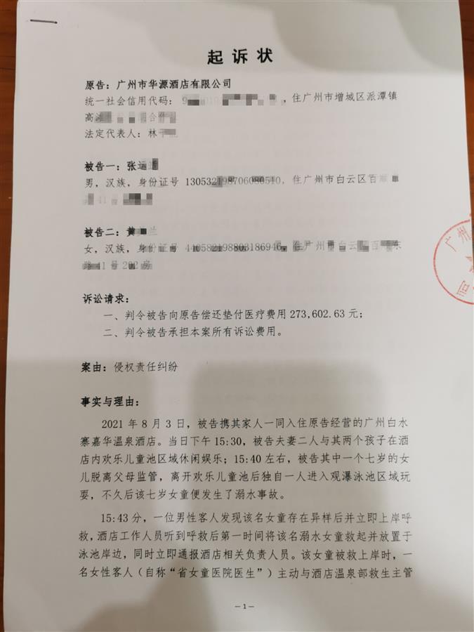 张先生的提供的涉事酒店方起诉状显示,原告为酒店的经营方广州市华源酒店有限公司,被告为张先生和他的妻子,酒店方要求判令被告向原告偿还垫付医疗费用273603.63元。