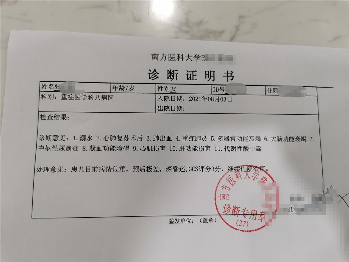 南方医科大学珠江医院出具的诊断证明书显示,萌萌为溺水,并造成了重症肺炎、大脑功能衰竭、多器官功能衰竭等多种重症。11月15日,在萌萌还在治疗期间,广州白水寨嘉华温泉酒店工作人员通知张先生,他已经被起诉至广州白云区法院。12月1日,经过4个月的治疗,萌萌因病重去世。