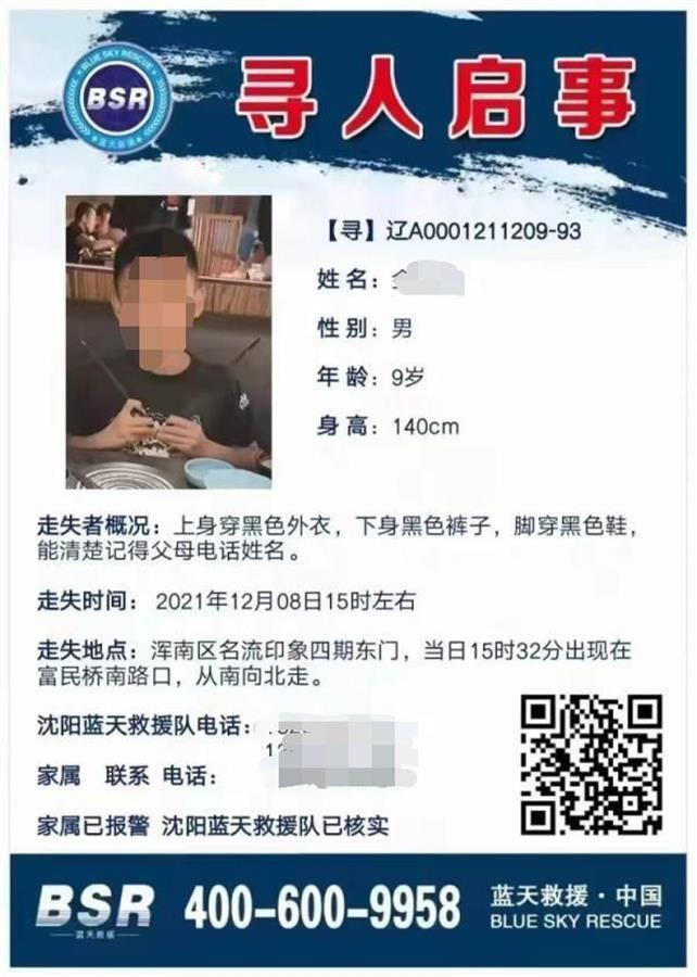 网传寻人启事显示,走失男童阳阳9岁,上身穿黑色外衣,下身穿黑色裤子。12月8日下午,男童从沈阳浑南区名流印象小区四期东门走出,当日15时曾出现在富民桥南路口附近的监控中,孩子从南向北走。