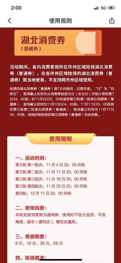 本轮湖北消费券普通券的有效期仍为发券首日起的7个自然日内,如12月11日20:00开始发放的第三轮首批消费券,用券截止时间为12月17日24:00。