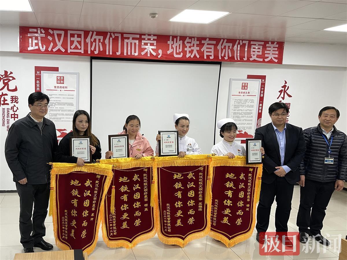 12月10日,在武汉地铁钟家村站,武汉地铁向挺身而出跪地参与生死急救的5名医护人员送上“武汉因你而荣,地铁有你更美”锦旗和“地铁好乘客”纪念牌。这也是武汉地铁今年第三次寻找到的“地铁好乘客”。