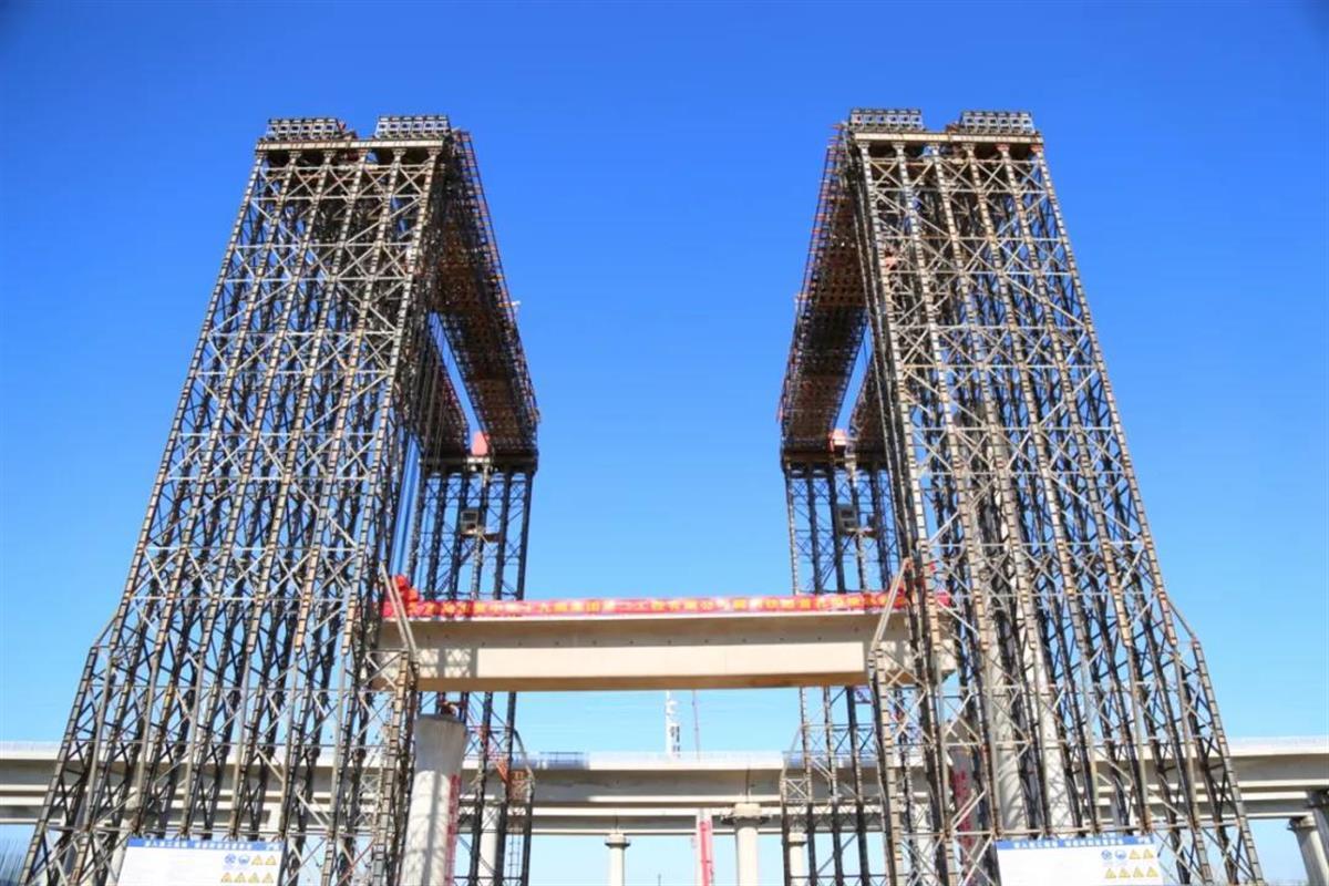 襄荆高铁首孔箱梁架设现场