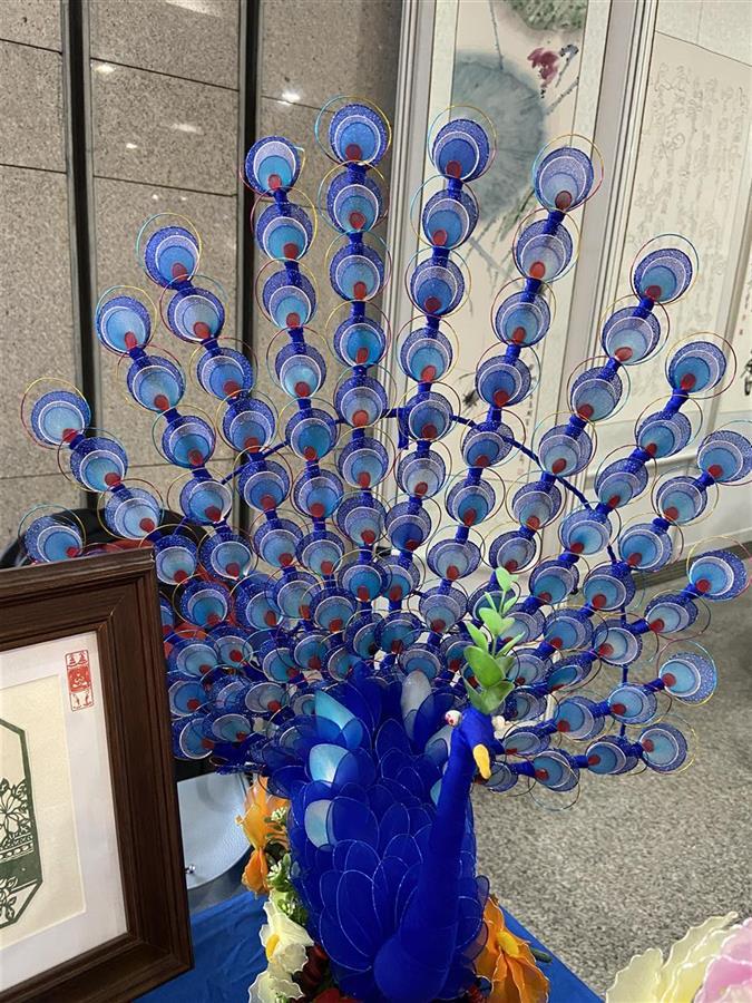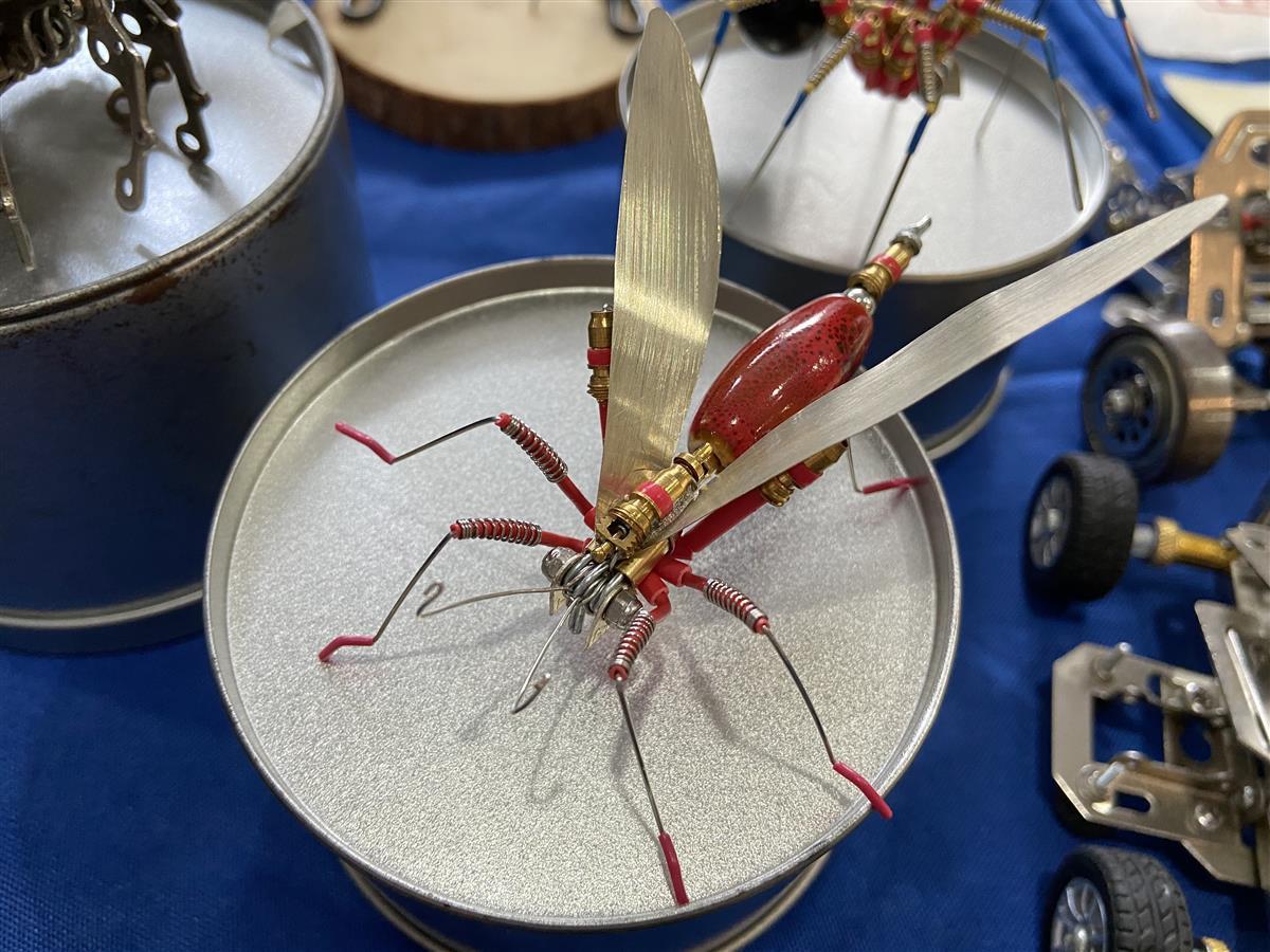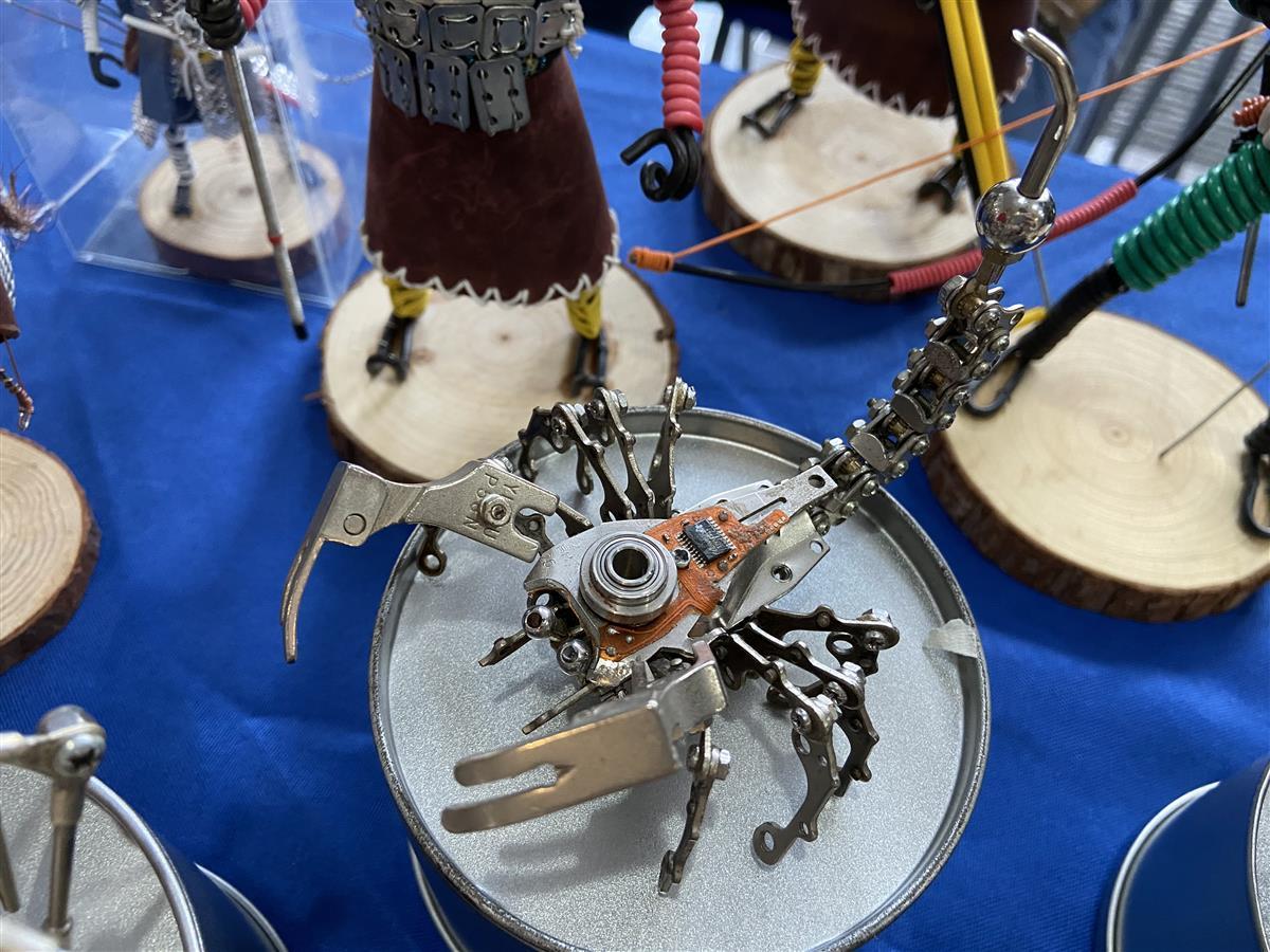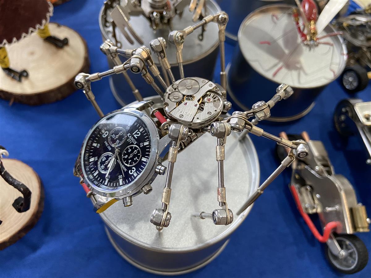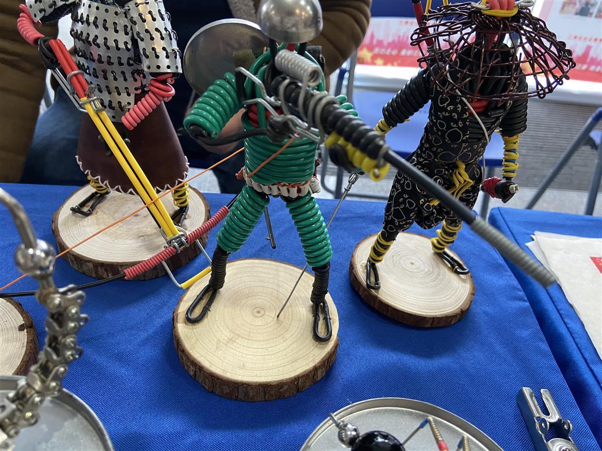 在全民终身学习成果展示环节,江岸区后湖社区代表何强的展台吸引了不少市民的目光,在他的展台上摆放了不少精致的手工制品。用废旧合页做的蝎子、用手表表盘和表芯制作成的蜘蛛、用电话线缠的人物……不少观展的市民夸赞这些手工制品十分精致,但仔细一看,这些摆件的组成零件竟全是生活中常见的废旧物品。