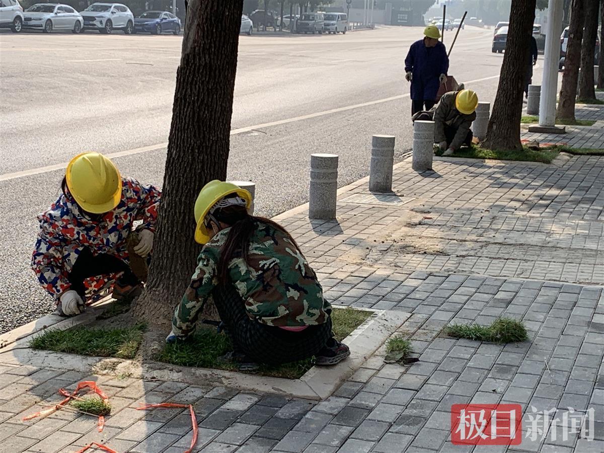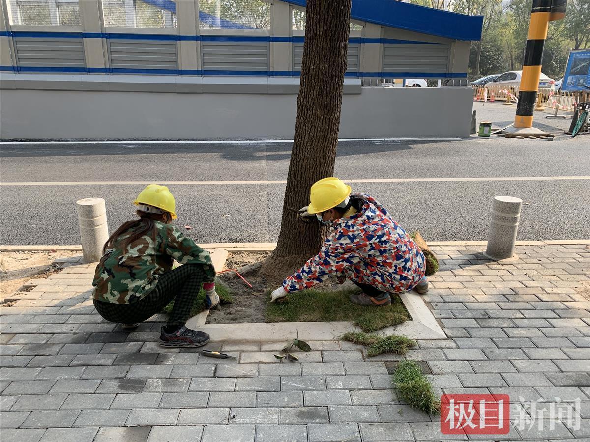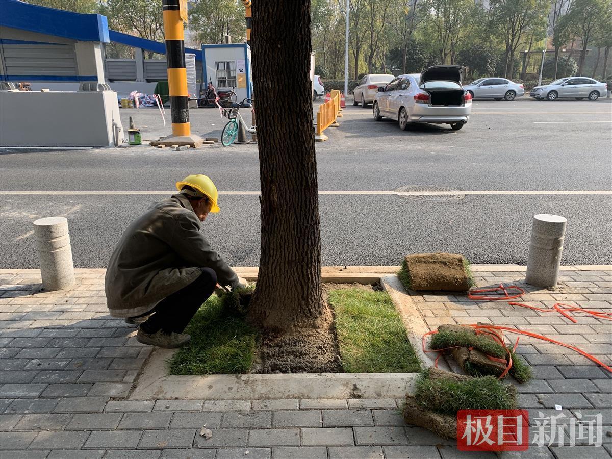“今天对这条路上的行道树树脚全部植上草皮,由于大树树脚裸露,遇阴雨天,树脚泥土成为人行道污染源之一,天晴时,大树又因裸露水分大量蒸发,影响大树成活,现在植上了草皮,即可给大树保湿保暖,防止泥土污染马路,还可以美化道路。”工人师傅告诉记者。