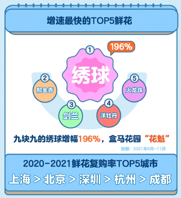 买菜顺便捎把花,平常人家的烟火气也平添浪漫。盒马春天有芍药、夏天有绣球、秋天有油画向日葵、冬天有多彩郁金香,消费者们也越来越“花心”。