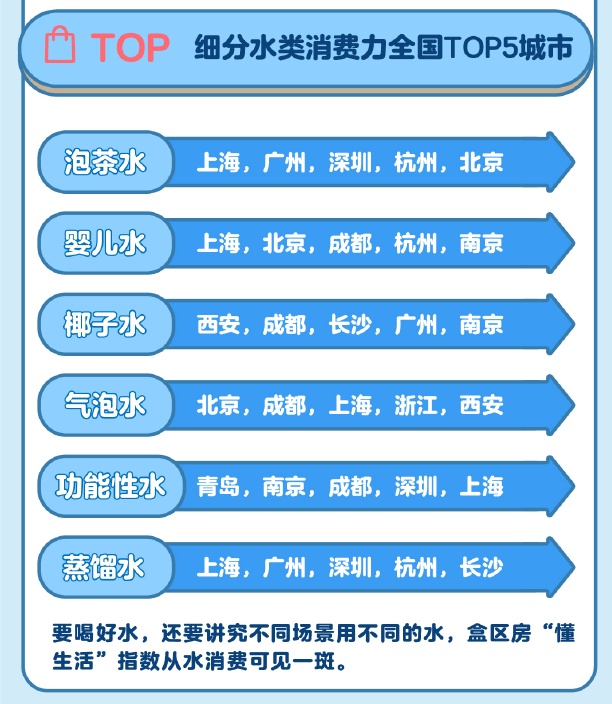 别以为只有对喝奶讲究,盒区房用户们喝水也不将就——不同场景要搭配不同种类的水,例如健身人士要喝椰子水、宝宝要喝婴儿水、泡茶、居家美容也有专门的水。