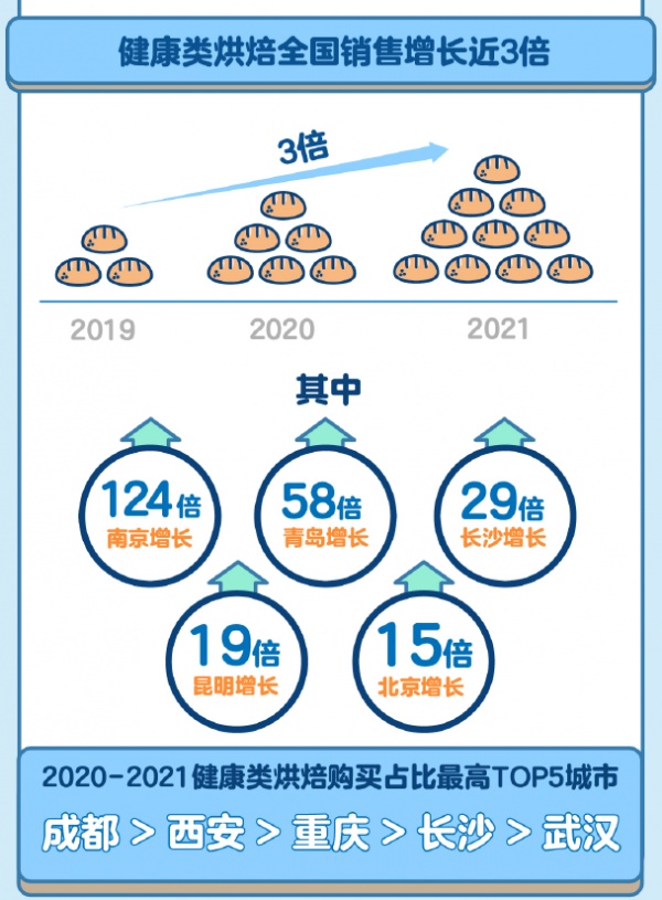 低糖低脂的消费偏好,在盒马烘焙品类中也表现明显:全麦、杂粮、零添加的烘焙产品增速加快,2020-2021健康类烘焙成交额占烘焙总量的比例,武汉在盒马全国27个城市中排名第五。