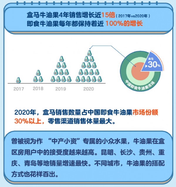 被誉为“森林黄油”的牛油果,曾被视为“中产小资”的专属。不会挑、不会吃,导致它的市场接受度不高。盒马从2018年全面上架即食牛油果,让用户买到熟度刚好的果实,销量逐年增长。