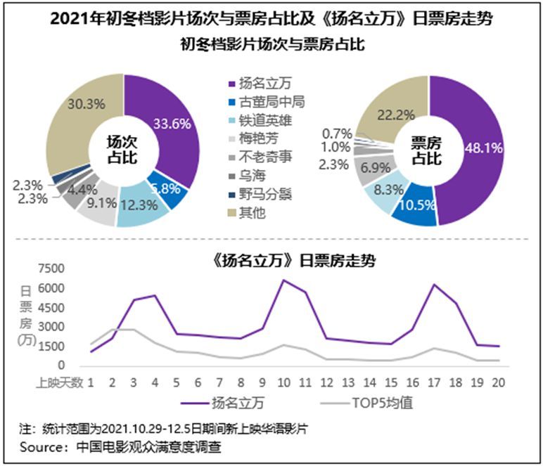 中国电影观众满意度调查·2021年初冬档调查结果显示,初冬档满意度84.4分,居近五年同期第一位,同比增长1.5分,同时较疫情前的2019年同期也增长了0.5分。其中悬疑喜剧片《扬名立万》满意度与票房双双“折桂”,音乐传记片《梅艳芳》、历史动作片《铁道英雄》、悬疑剧情片《古董局中局》满意度也悉数超83分。档期内类型和题材丰富多元的内容组合较好的满足了日趋多元细分的观影口味,得到了观众的高满意度评价。